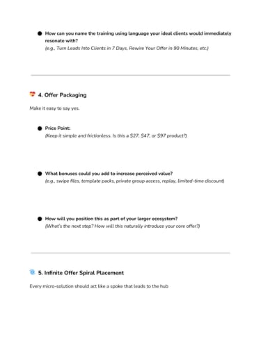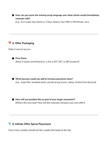 Use the Micro-Solution Quick Start Guide™ to craft a low-ticket offer that attracts ideal buyers and pre-qualifies them for your higher-tier work.Plug-and-Play Sequences to Warm Up Leads